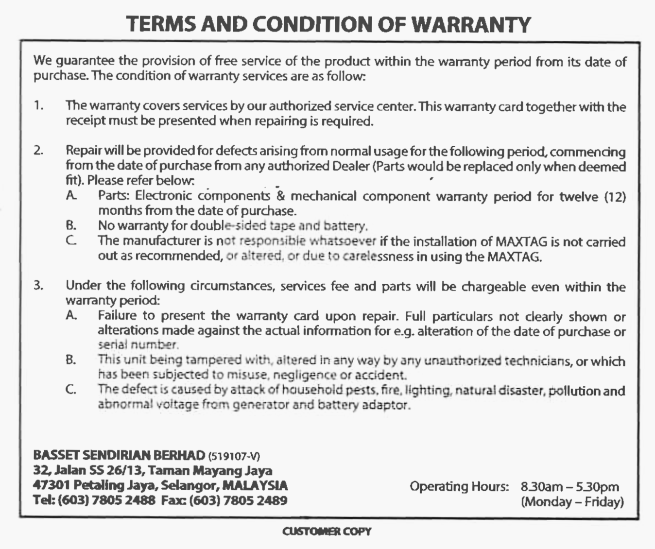 All MaxTag devices come with either a 1-year or 3-year manufacturer’s warranty, depending on the package that you purchased. All units come with a unique serial number to identify which warranty it comes with.